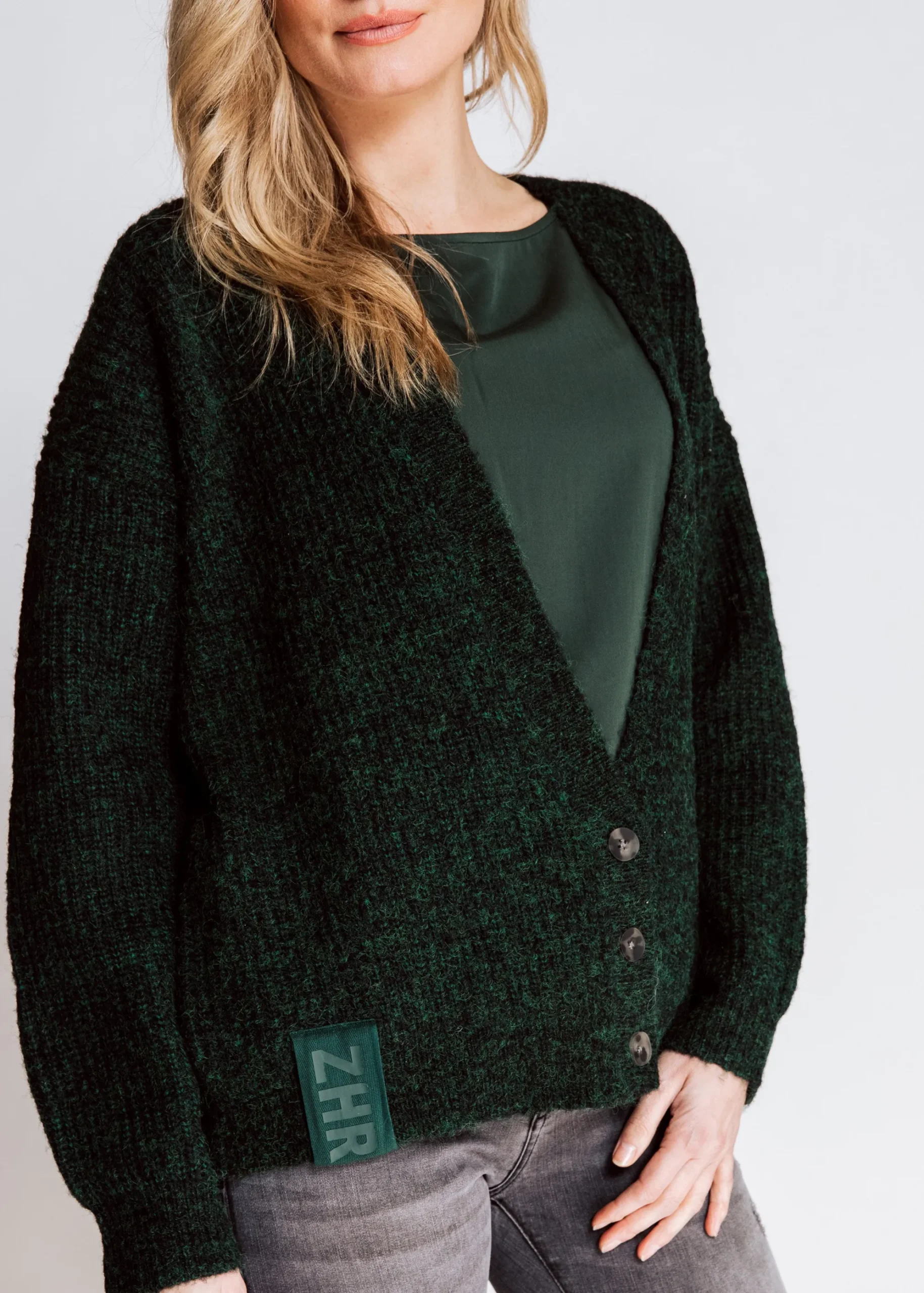 Details: Feinstrickoptik – Logo Patch am Saum – Knopfleiste mit 3 Knöpfen