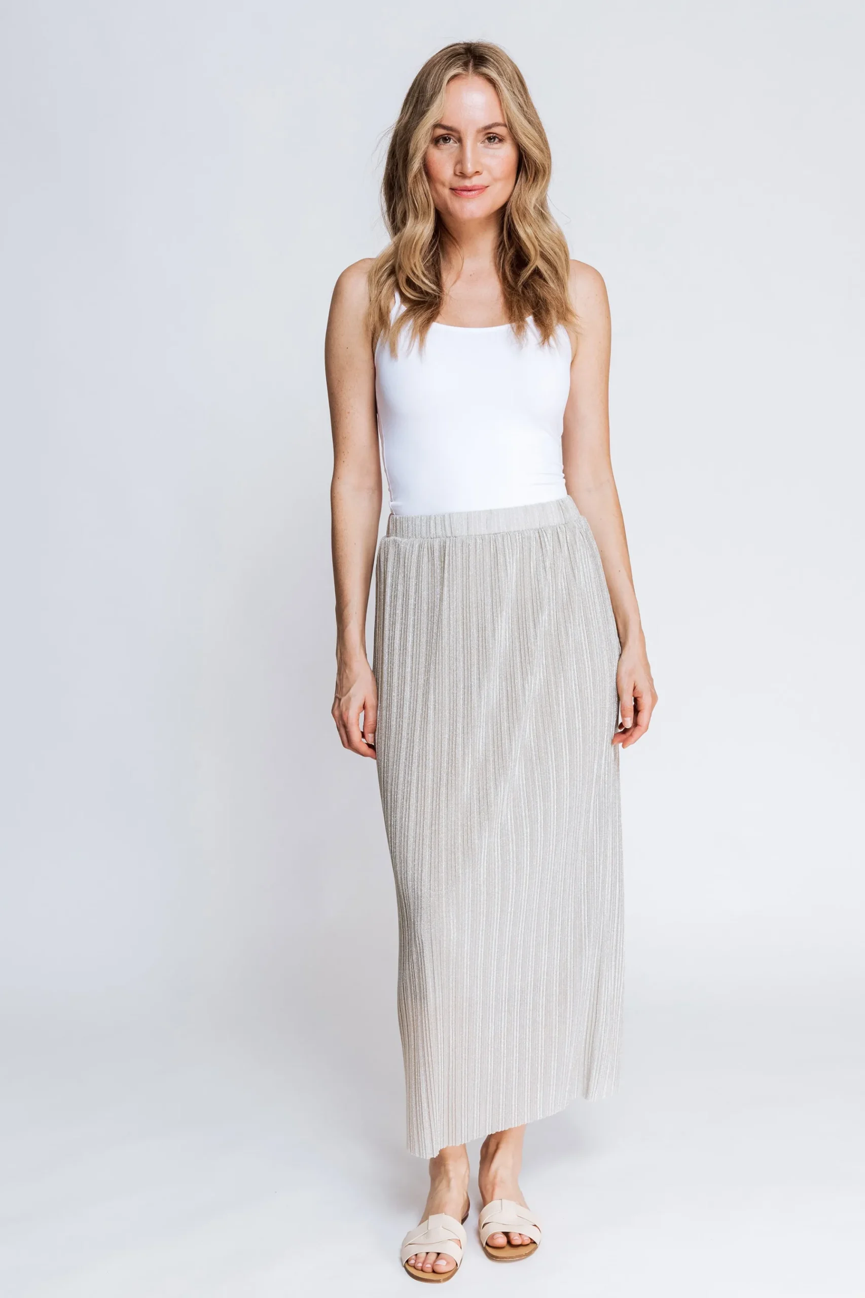- Design: Der Rock ist mit schmalen, vertikalen Falten versehen, die für eine schlanke Silhouette sorgen