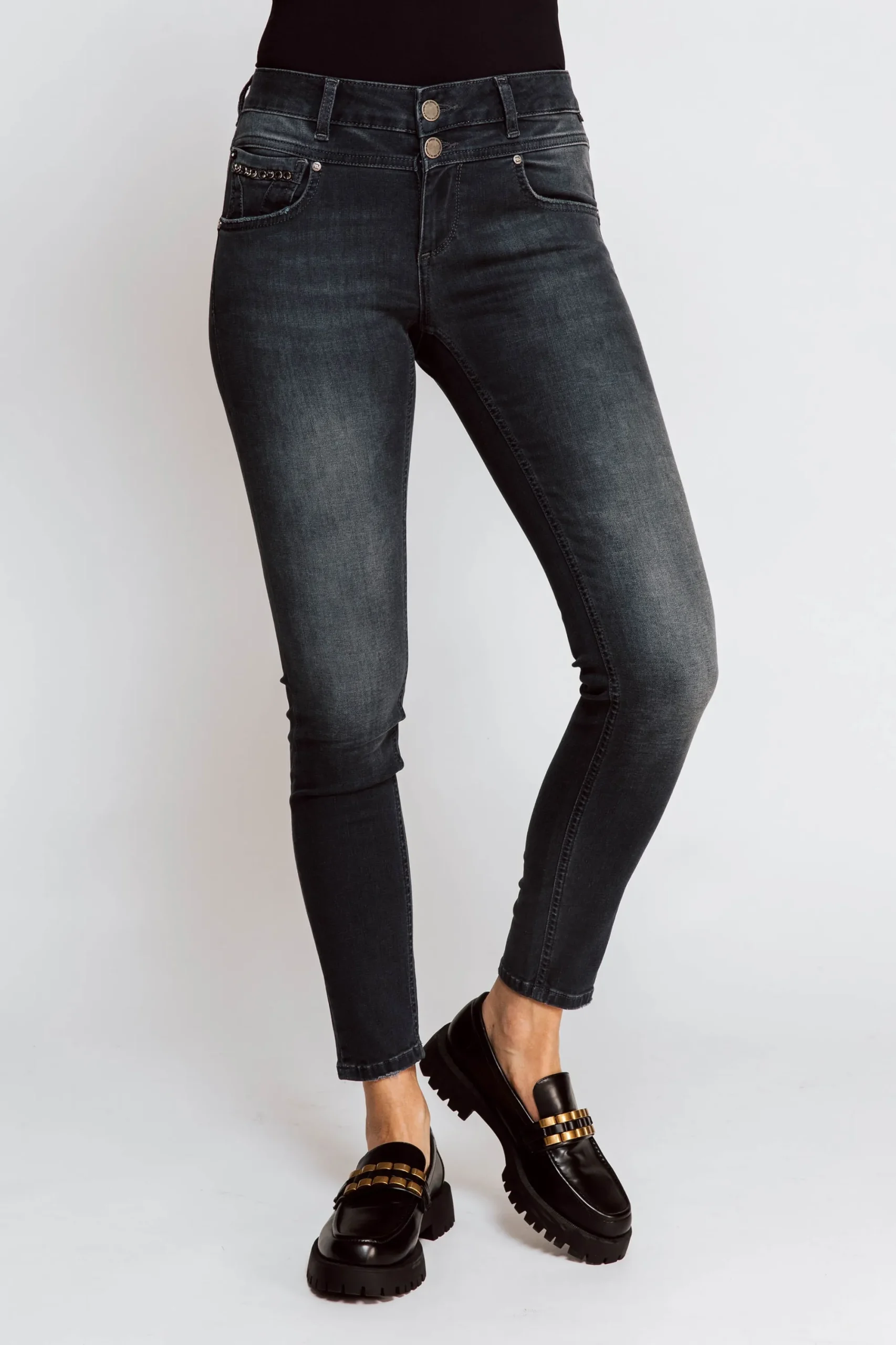 - Details: dezente Nieten-Applikationen an der Tasche – Verschluss mit Doppelknopf & Reißverschluss