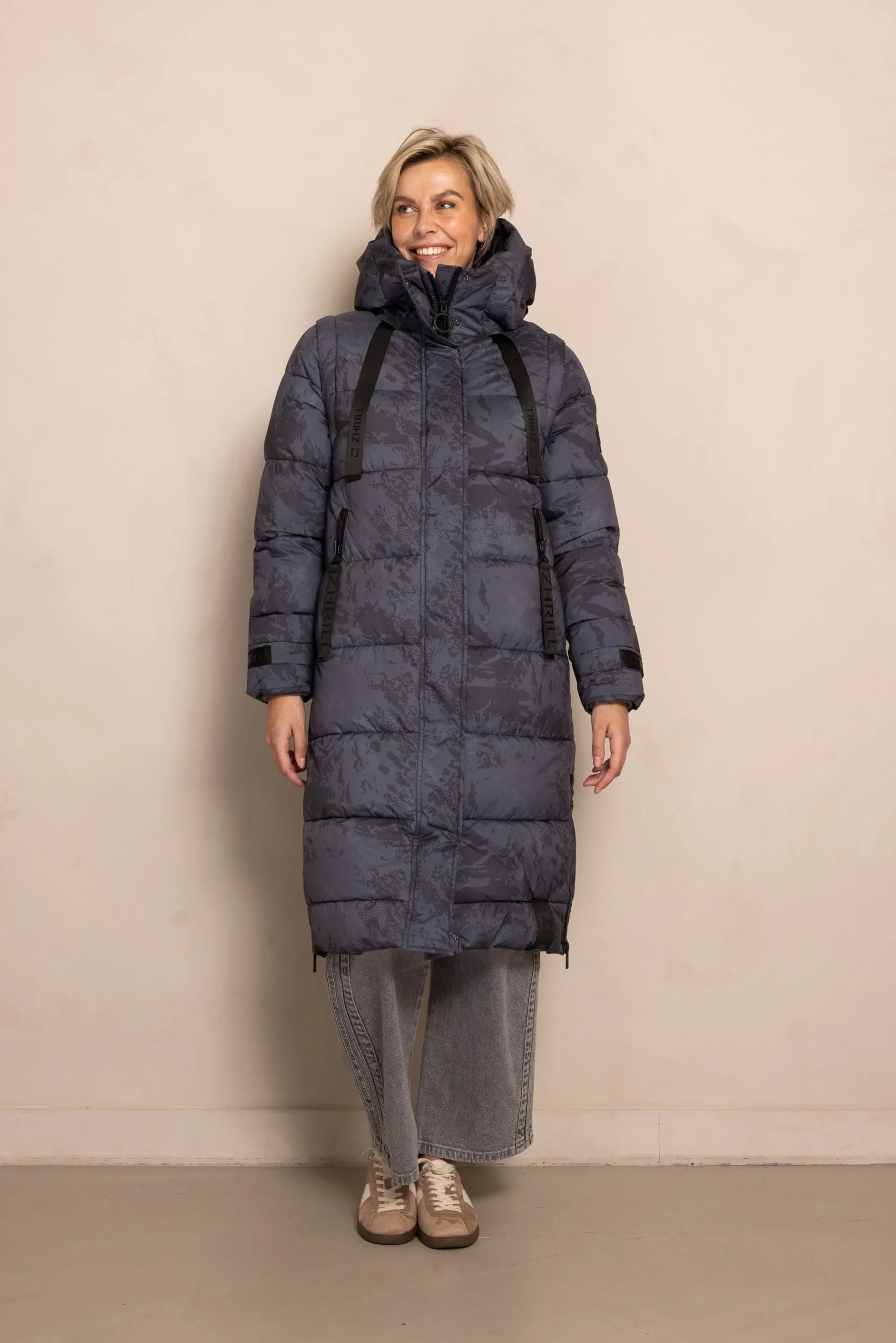 - Schriftzug „Zhrill“ am unteren Saum als stilvolles Detail