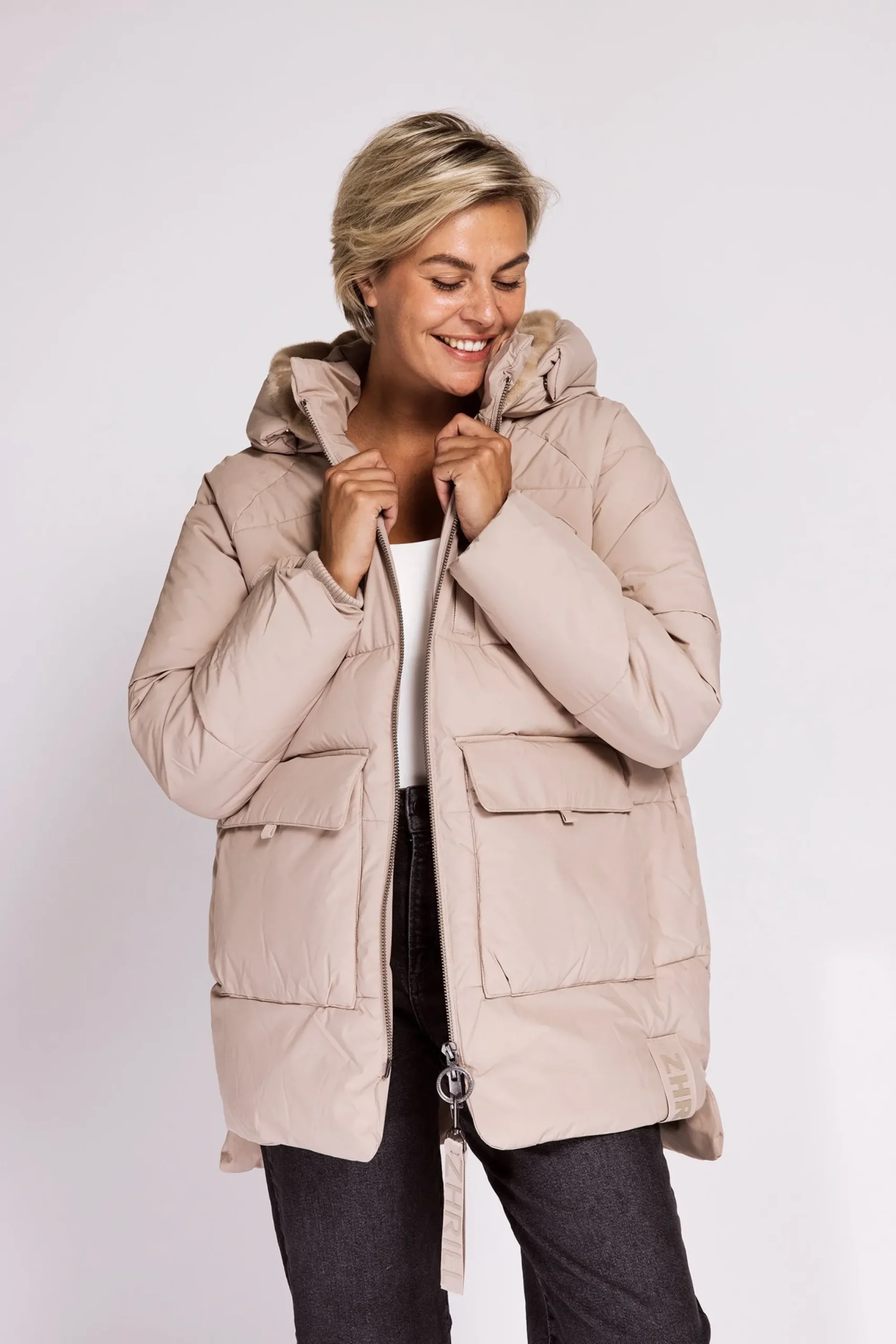 Reißverschluss vorne mit zusätzlichem Riegel-Detail auf Brusthöhe