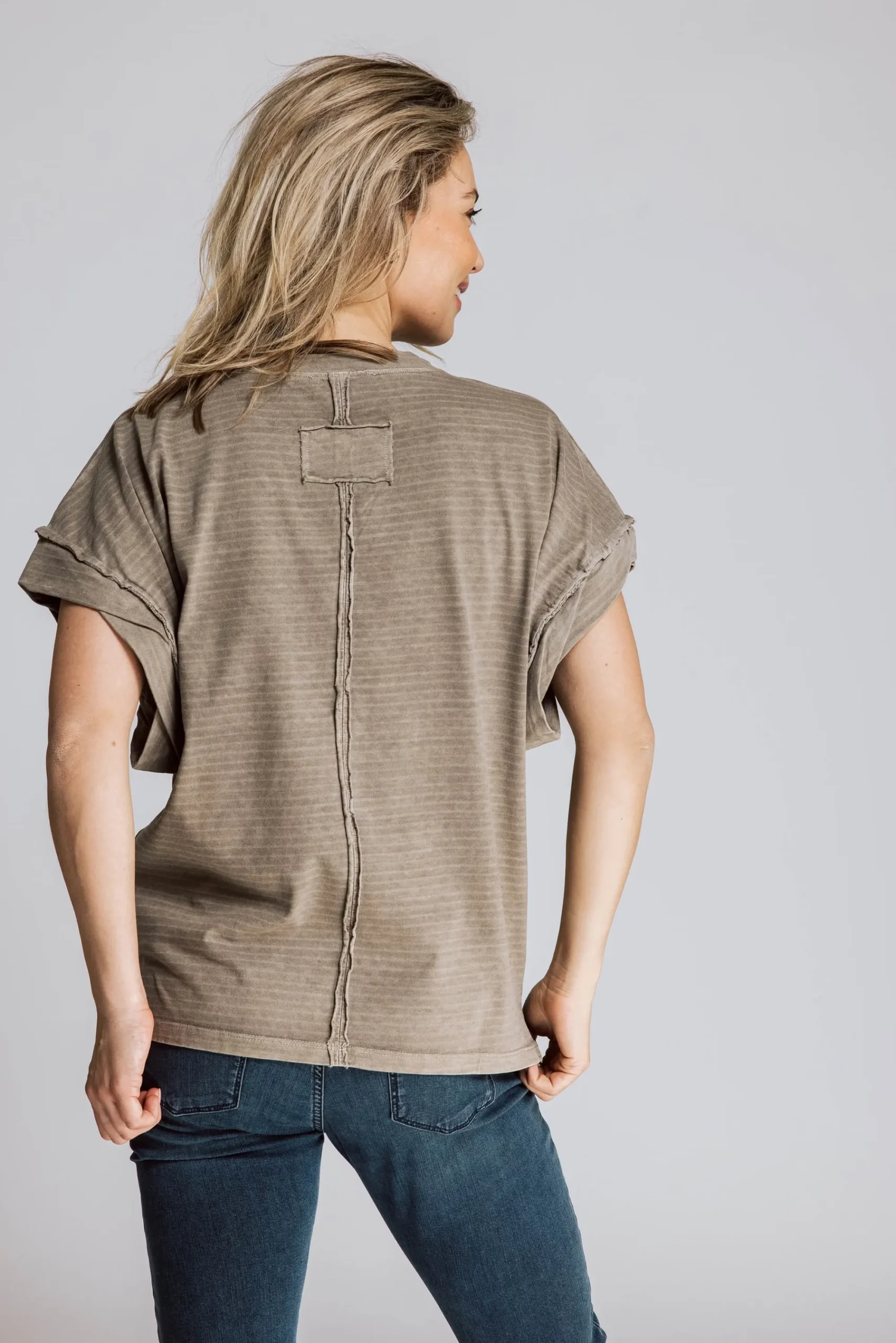 - Überschnittene Schultern und umgeschlagene Ärmelabschlüsse